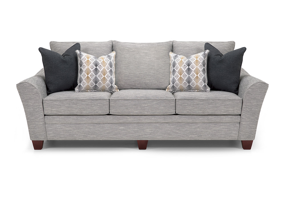 Experience a touch of “flare” with the meticulously crafted, thoughtfully designed collection which includes a sofa, loveseat, chair & a half and matching ottoman. All pieces are upholstered in a soft, durable gray fabric that is contrasted with coordinating accent pillows. Flared arms add a contemporary element, while solid wooden legs provide increased durability. The Eastbrook Collection features WOW Seating System, which combines precision-cut wood frames with gel-blended foam seating for exceptional support. The reversible seat and back cushions are designed to be flipped, allowing for even wear and extending the lifespan of your furniture. Also available in Hannigan Fog.